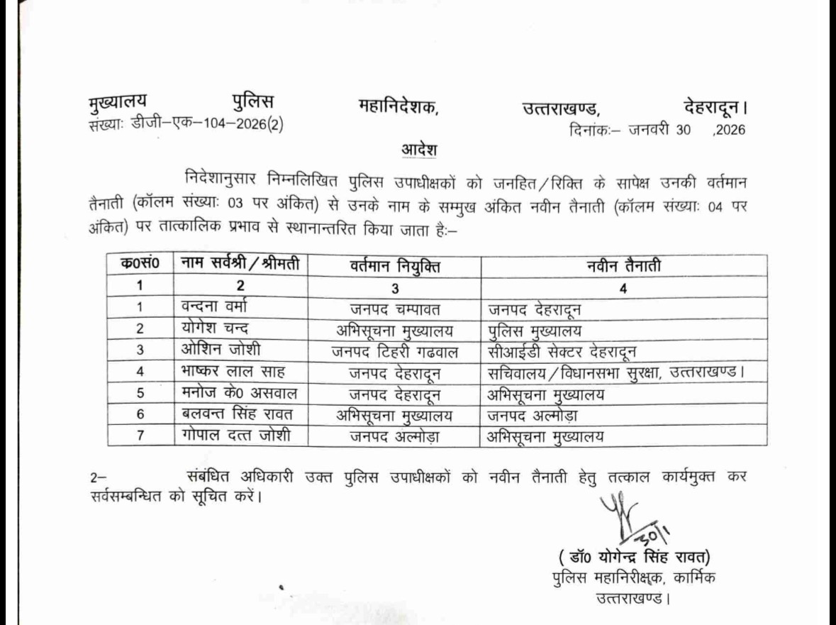 NewsUttarakhand उत्तराखंड पुलिस में बंबर ट्रांसफर, दीपशिखा बनी एसपी विजिलेंस उत्तराखंड एक्स्प्रेस न्यूज़January 30, 2026January 30, 2026 Spread the love Screenshot Spread the love