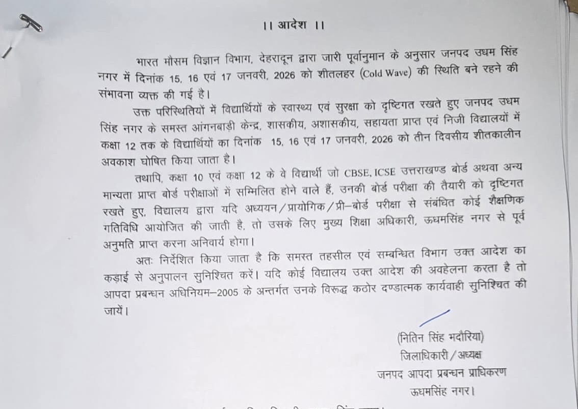 KumaunNewsUdham Singh NagarUttarakhand शीत लहर के चलते जिलाधिकारी ने की स्कूलों की तीन दिन की छुट्टी उत्तराखंड एक्स्प्रेस न्यूज़January 14, 2026January 14, 2026 Spread the love Spread the love