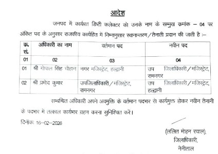 हल्द्वानी: हल्द्वानी में प्रशासनिक फेरबदल के तहत जिलाधिकारी ललित मोहन रयाल ने उपजिलाधिकारी स्तर पर तबादले किए हैं। व्यवहार कुशल और सक्रिय अधिकारी माने जाने वाले गोपाल सिंह चौहान को रामनगर का नया एसडीएम बनाया गया है, जबकि प्रमोद कुमार को रामनगर से स्थानांतरित कर हल्द्वानी का एसडीएम नियुक्त किया गया है। प्रशासनिक स्तर पर किए गए इस बदलाव को व्यवस्था को और अधिक प्रभावी व सुदृढ़ बनाने की दिशा में महत्वपूर्ण कदम माना जा रहा है।