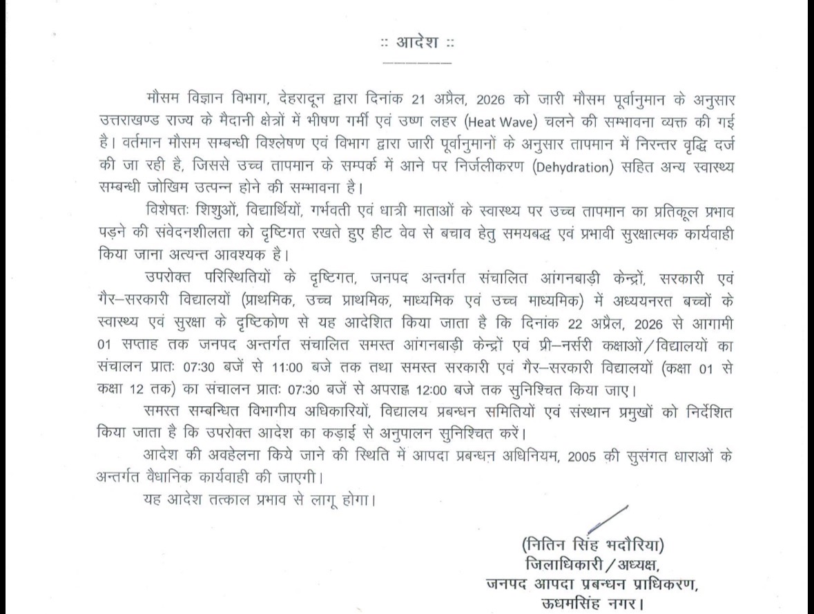 KumaunNewsUdham Singh NagarUttarakhand मौसम विभाग के भीषण गर्मी की चेतावनी के बाद स्कूलों का टाइम बदला उत्तराखंड एक्स्प्रेस न्यूज़April 21, 2026April 21, 2026 Spread the love Spread the love