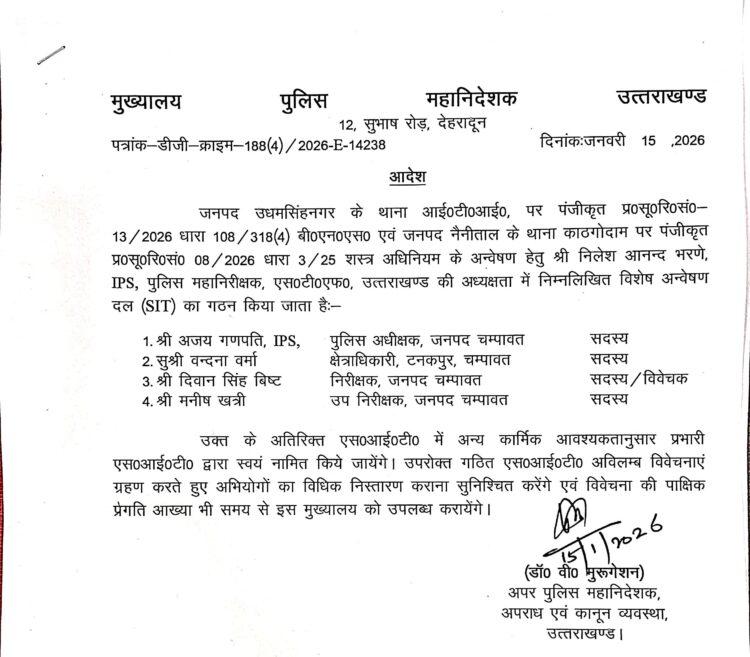 देहरादून। सुखवन्त सिंह आत्महत्या मामले को लेकर उत्तराखण्ड पुलिस मुख्यालय ने बड़ी और निर्णायक कार्रवाई की है। निष्पक्ष, पारदर्शी और गहन जांच सुनिश्चित करने के उद्देश्य से पुलिस महानिरीक्षक एसटीएफ की अध्यक्षता में विशेष जांच दल (SIT) का गठन किया गया है, जबकि मामले से जुड़े 12 पुलिस कर्मियों को तत्काल प्रभाव से गढ़वाल रेंज के जनपदों में स्थानांतरित कर दिया गया है। इस कार्रवाई को पुलिस विभाग के भीतर सख्त संदेश के रूप में देखा जा रहा है। पुलिस मुख्यालय के अनुसार जनपद ऊधम सिंह नगर के थाना आईटीआई क्षेत्र के ग्राम पैगा निवासी सुखवन्त सिंह ने 10–11 जनवरी 2026 की रात काठगोदाम, हल्द्वानी में आत्महत्या कर ली थी। इस संवेदनशील प्रकरण में सामने आए तथ्यों और आरोपों को गंभीरता से लेते हुए अब मामले की विवेचना उच्चस्तर पर कराई जा रही है। पुलिस महानिरीक्षक एसटीएफ नीलेश आनन्द भरणे की अध्यक्षता में गठित पांच सदस्यीय SIT में पुलिस अधीक्षक चम्पावत अजय गणपति, क्षेत्राधिकारी टनकपुर वंदना वर्मा, निरीक्षक दिवान सिंह बिष्ट तथा उपनिरीक्षक मनीष खत्री को शामिल किया गया है, जिन्हें मामले की हर पहलू से जांच के निर्देश दिए गए हैं।