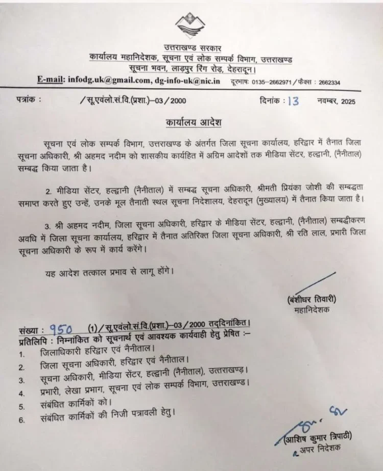 वहीं, वर्तमान में मीडिया सेंटर हल्द्वानी में सम्बद्ध सूचना अधिकारी प्रियंका जोशी की सम्बद्धता समाप्त कर उन्हें उनके मूल तैनाती स्थल, सूचना निदेशालय देहरादून (मुख्यालय) में तैनात किया गया है।